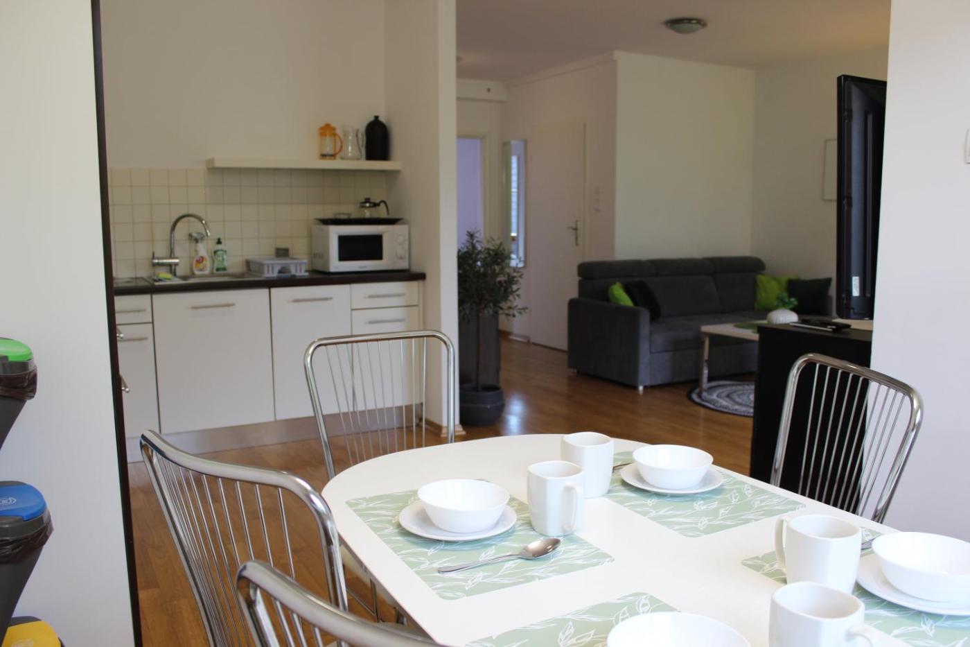 Oferta apartamentu obejmuje kilka sypialni (2), salon, aneks kuchenny z pełnym wyposażeniem, w tym lodówką i czajnikiem, a także łazienkę (1) z prysznicem oraz suszarką do włosów. W apartamencie zapewniono ręczniki i pościel.