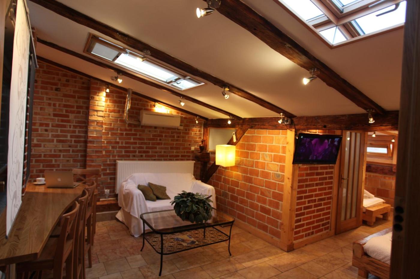 Studio na poddaszu. Apartament ten mieści się na poddaszu. Dysponuje on podłogą wyłożoną marmurem i oknami dachowymi. Wnętrze zdobią odsłonięte drewniane belki. W apartamencie znajduje się 32-calowy telewizor HD oraz w pełni wyposażony aneks kuchenny. Studio - 2 osobowy. Powierzchnia pokoju ok.: 19 mkw. ;